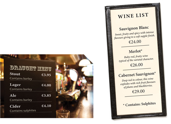 Allergen declarations for non‑prepacked beverages may be provided in several ways. For example, wine lists may include sulphite information for specific wines, while allergen information for other beverages—such as cocktails—may be displayed beside the drinks or added to the price list in one or more conspicuous locations on the premises. The required allergen information must be presented using the wording “Contains…”.