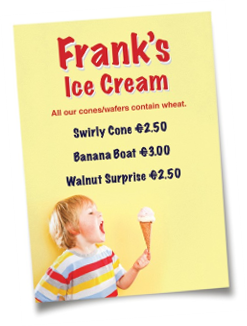 - relate directly to a food or beverage so there is no confusion about which food it relates to. It is not acceptable to say ‘Our food contains…’. You must identify the exact food, e.g., ‘spaghetti bolognaise - contains milk, celery, wheat’.