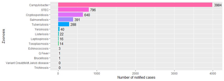 The numbers associated with each zoonosis may vary from prior years due to continuous updates of notification data in the Computerised Infectious Disease Reporting (CIDR) system.