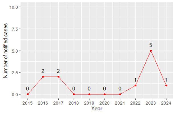 Figure 3 Number of brucellosis cases notified in Ireland from 2015 to 2024.