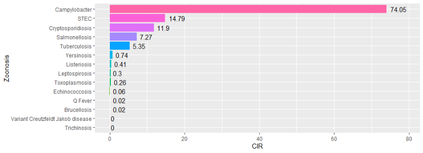 Figure 2 Crude incidence rate (CIR) per 100,000 population of zoonotic disease cases notified in Ireland for 2024 (based on HPSC provisional figures).