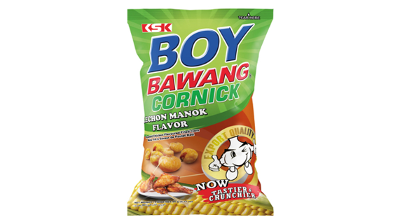 Product Identification: KSK Boy Bawang Cornick Lechon Manok Flavor (Corn Snacks Roasted Chicken Flavour); pack size: 90g