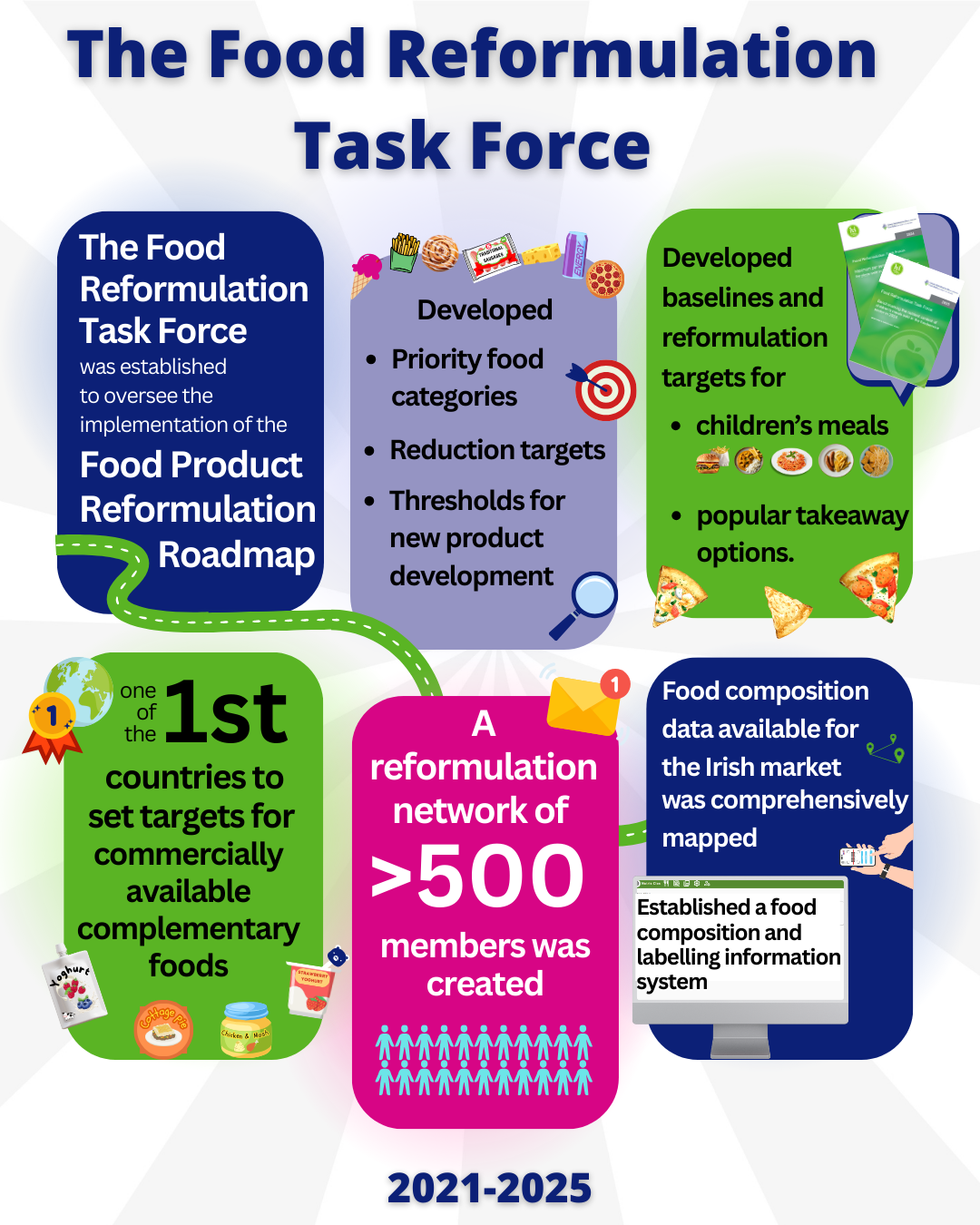 The Food Reformulation Task Force was established in 2022 and since then has implemented an ambitious and wide-reaching programme of activities to achieve the targets set out in A Roadmap for Food Product Reformulation. The continuation of the Task Force until 2027, is funded by the Department of Health and based in the Food Safety Authority of Ireland and will be overseen by an Oversight and Monitoring Group chaired by the Department of Health. Food reformulation is also a key action in Ireland’s Food Vision Strategy 2030.