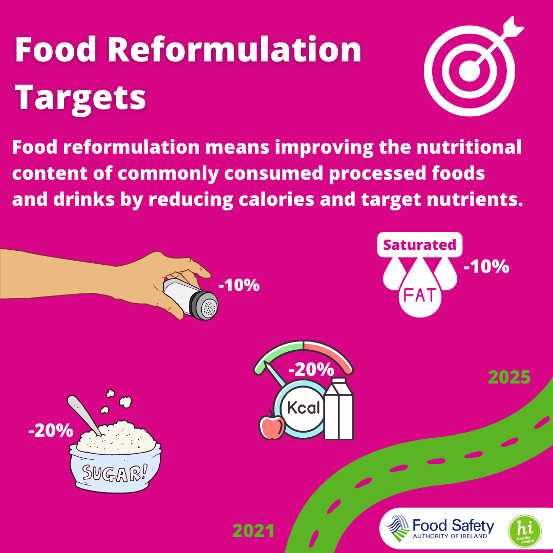 Food reformulation means improving the nutritional content of commonly consumed processed foods and drinks by reducing calories and target nutrients (such as saturated fat, salt and sugar). The goal of reformulation is to reduce target nutrients without increasing the energy content or nutrients of concern to ensure healthier food choices are available to Irish consumers. The Food Reformulation Task Force is responsible for implementing a Reformulation Roadmap with specific targets which will continue to be tracked from initial baseline figures in 2015.